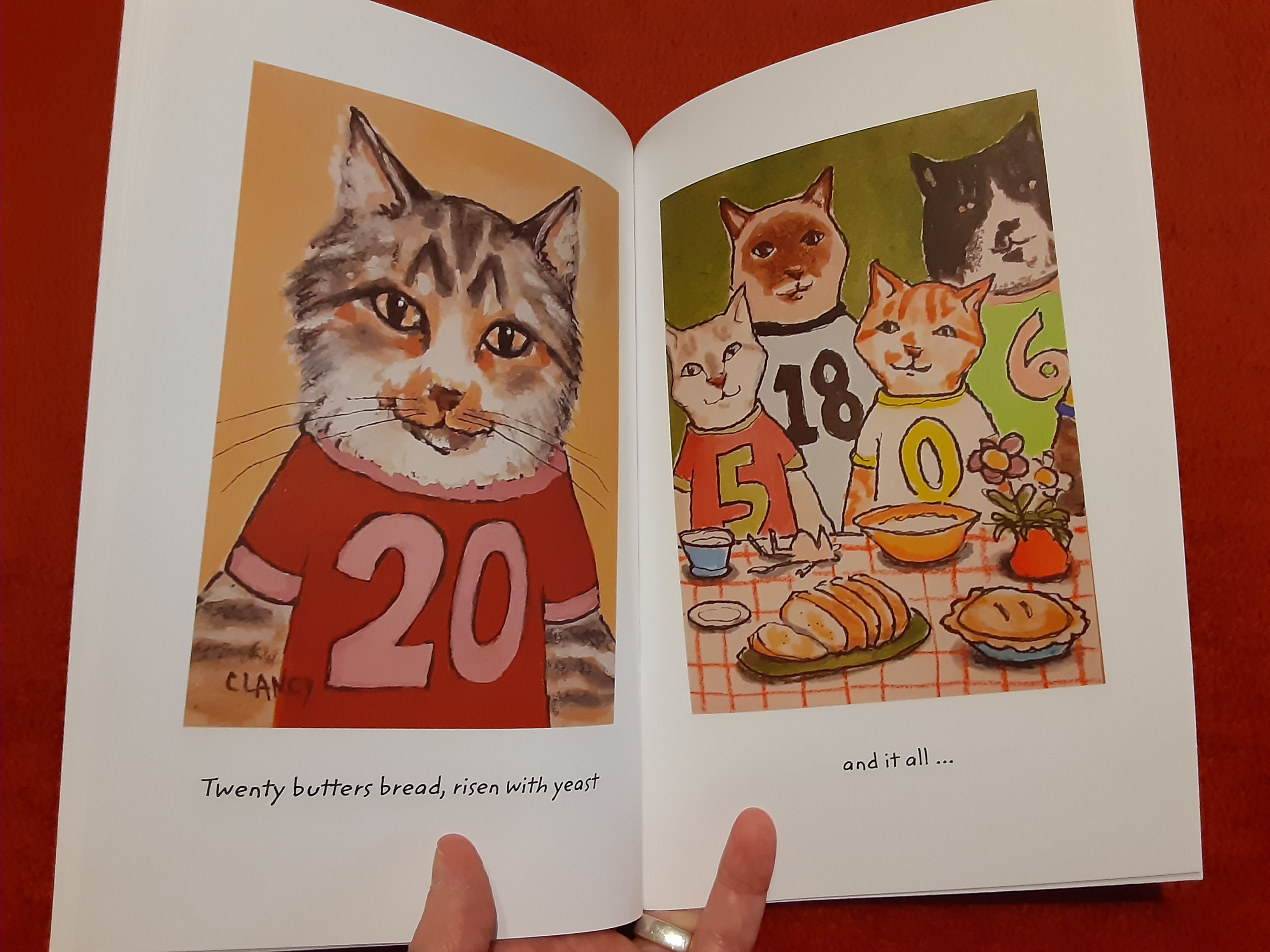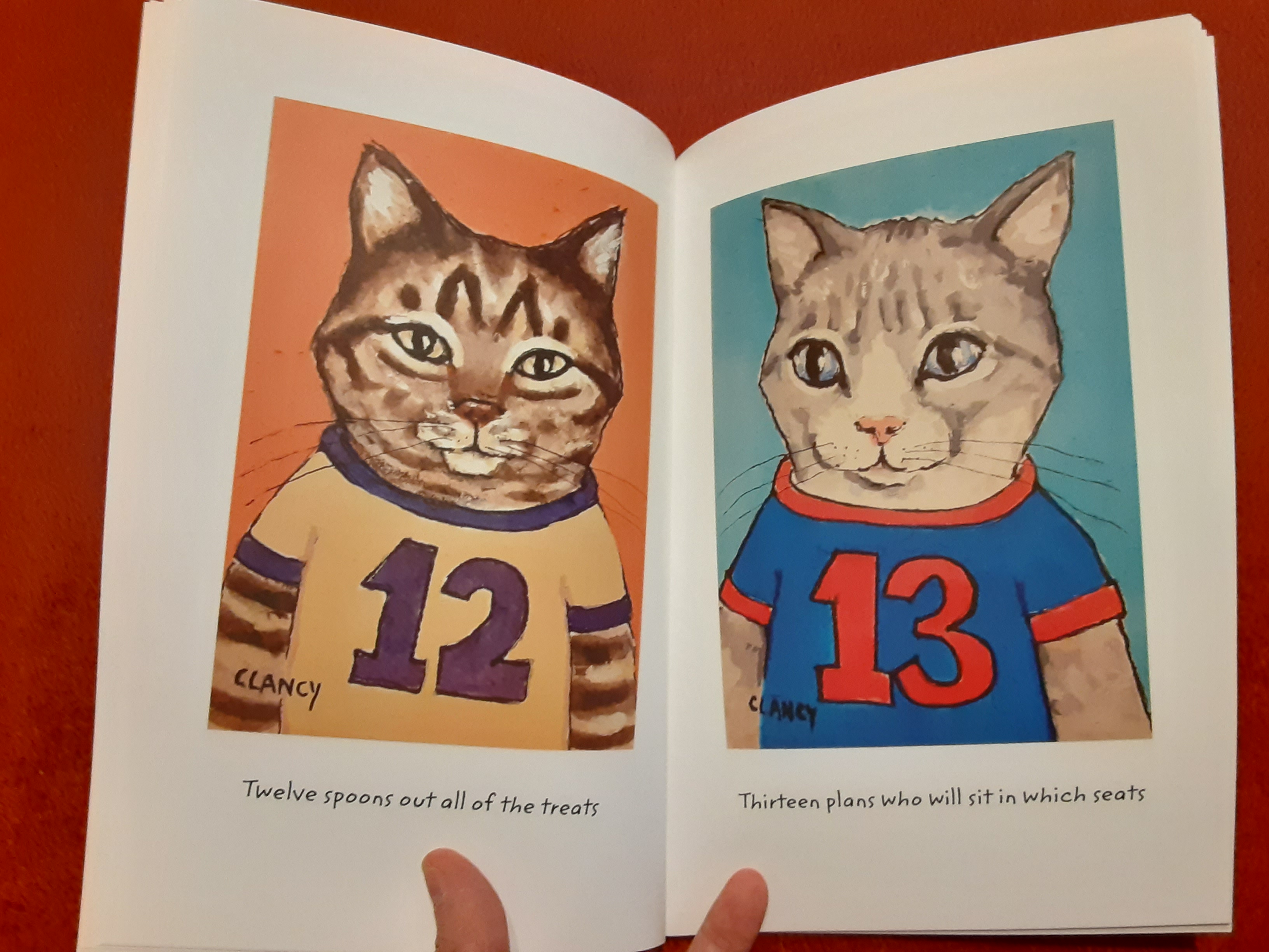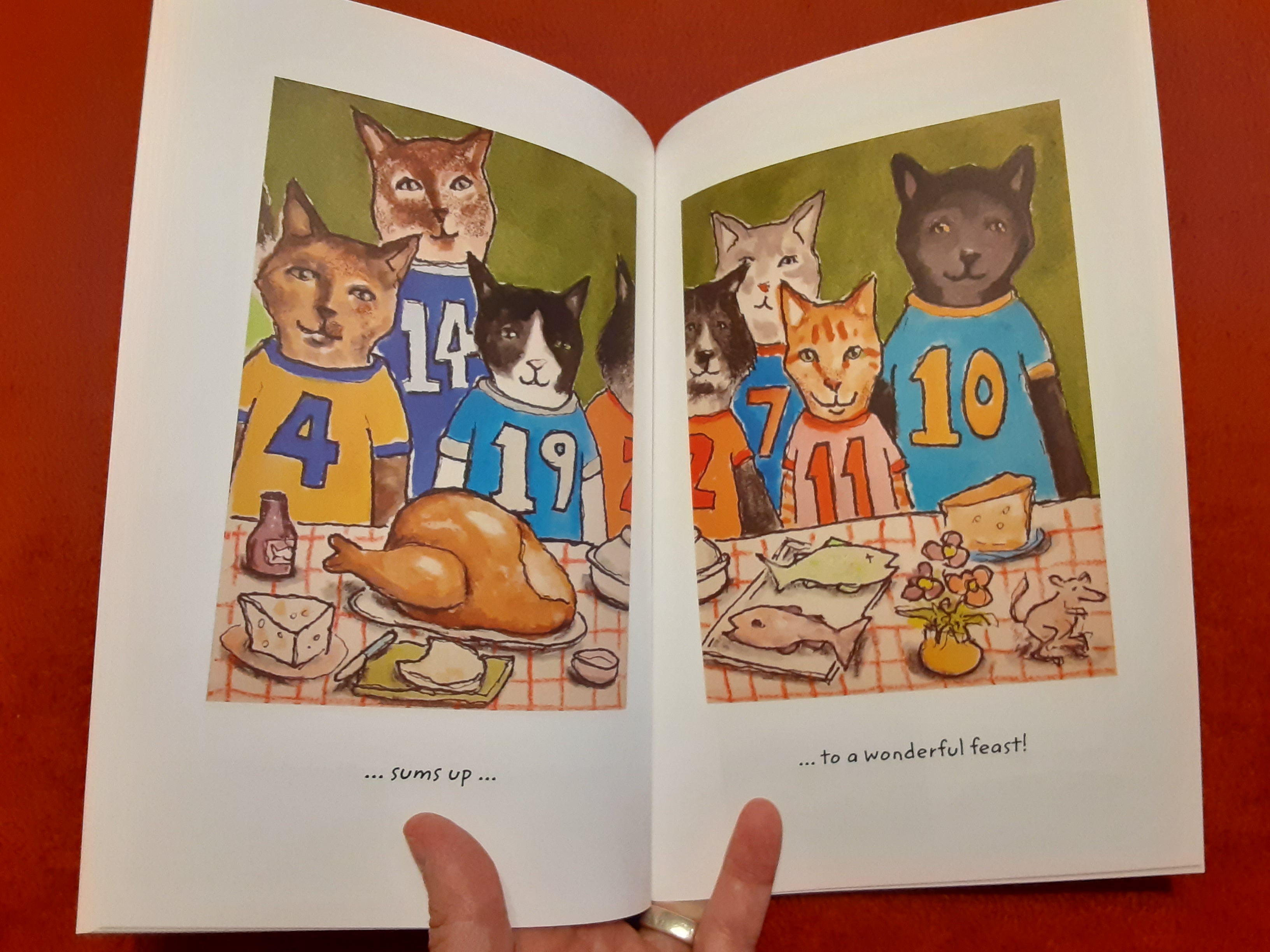 Specifically it’s an illustrated poem about cats and numbers โ a playful summing up of what happens when everyone brings something pleasant to the table. Every contribution counts!