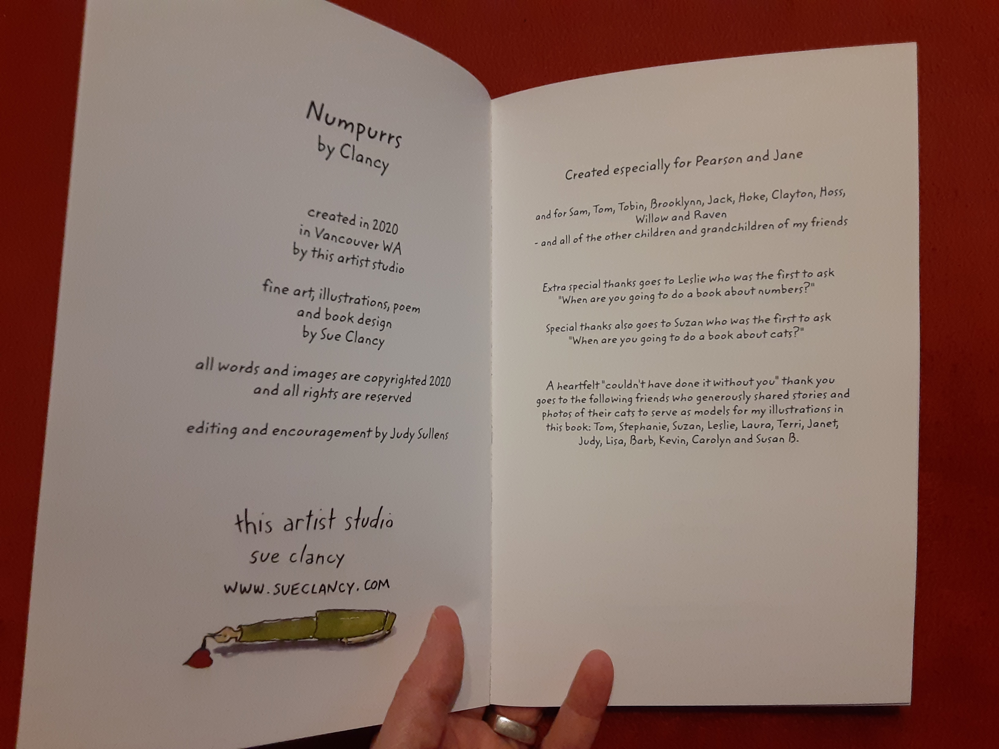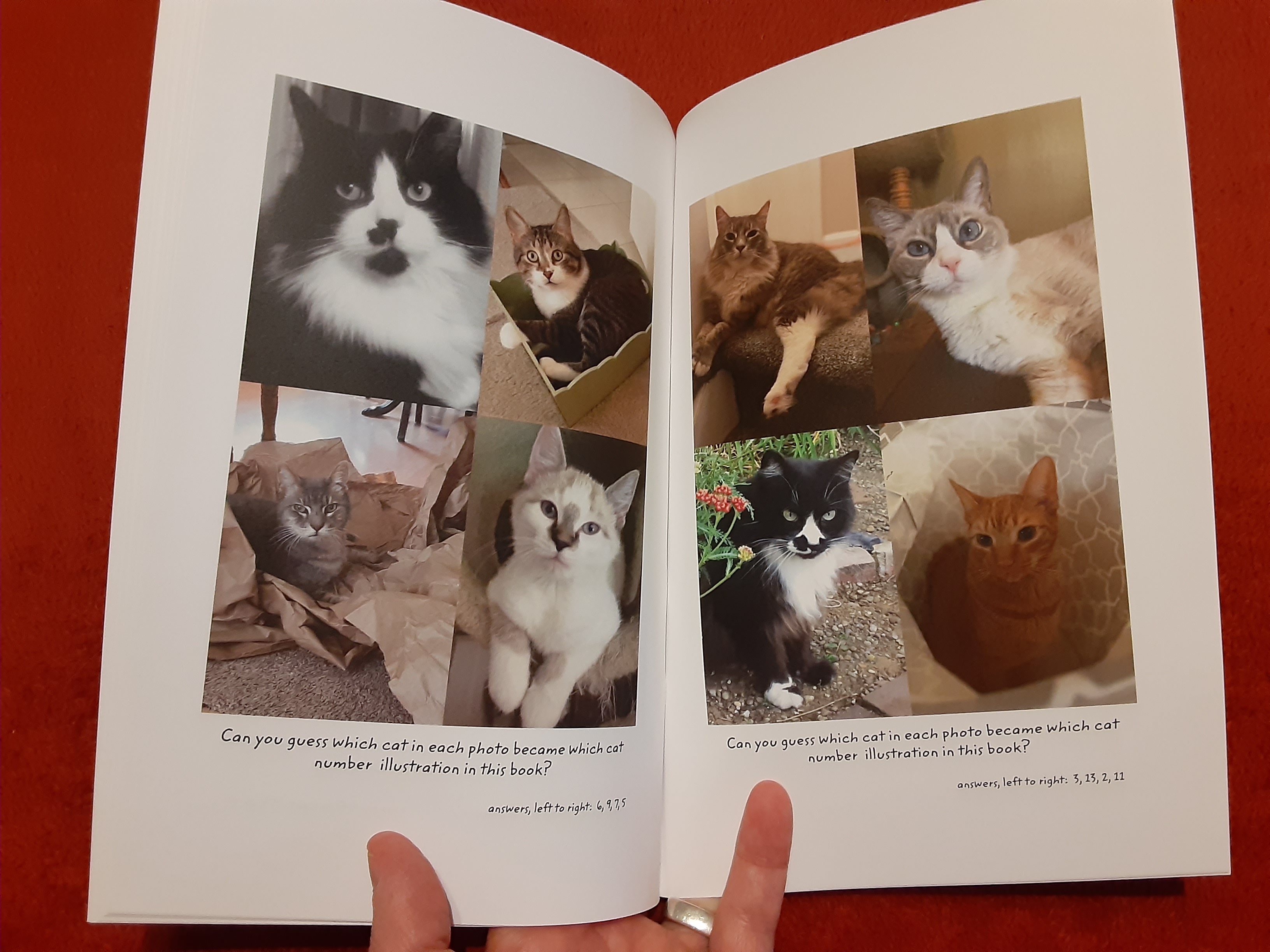 Here’s a look at the printed book. 36 color pages. 6 x 9 inches. Choice of hard or softcover. In the back of the book you can see some of the cat “models” that inspired the Numpurrs artwork. The print books are available via this link https://www.blurb.com/b/10297565-numpurrs .