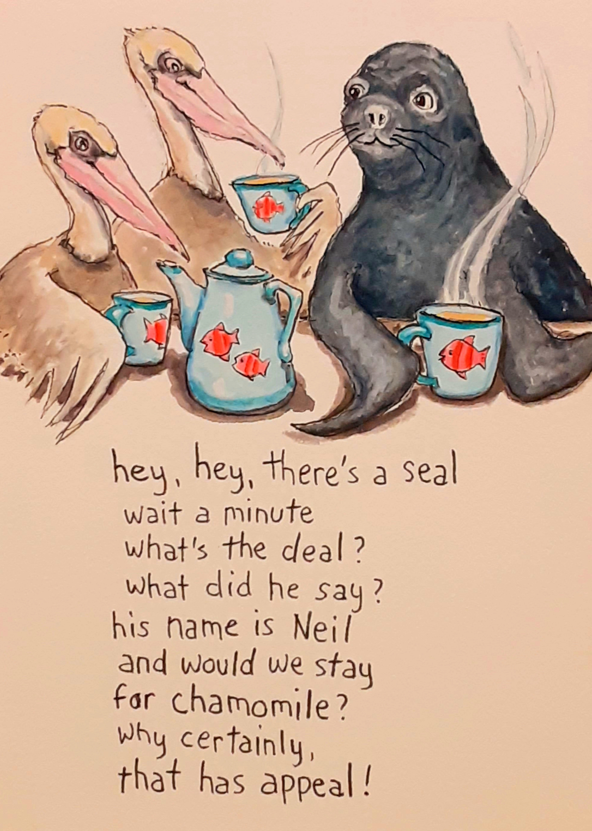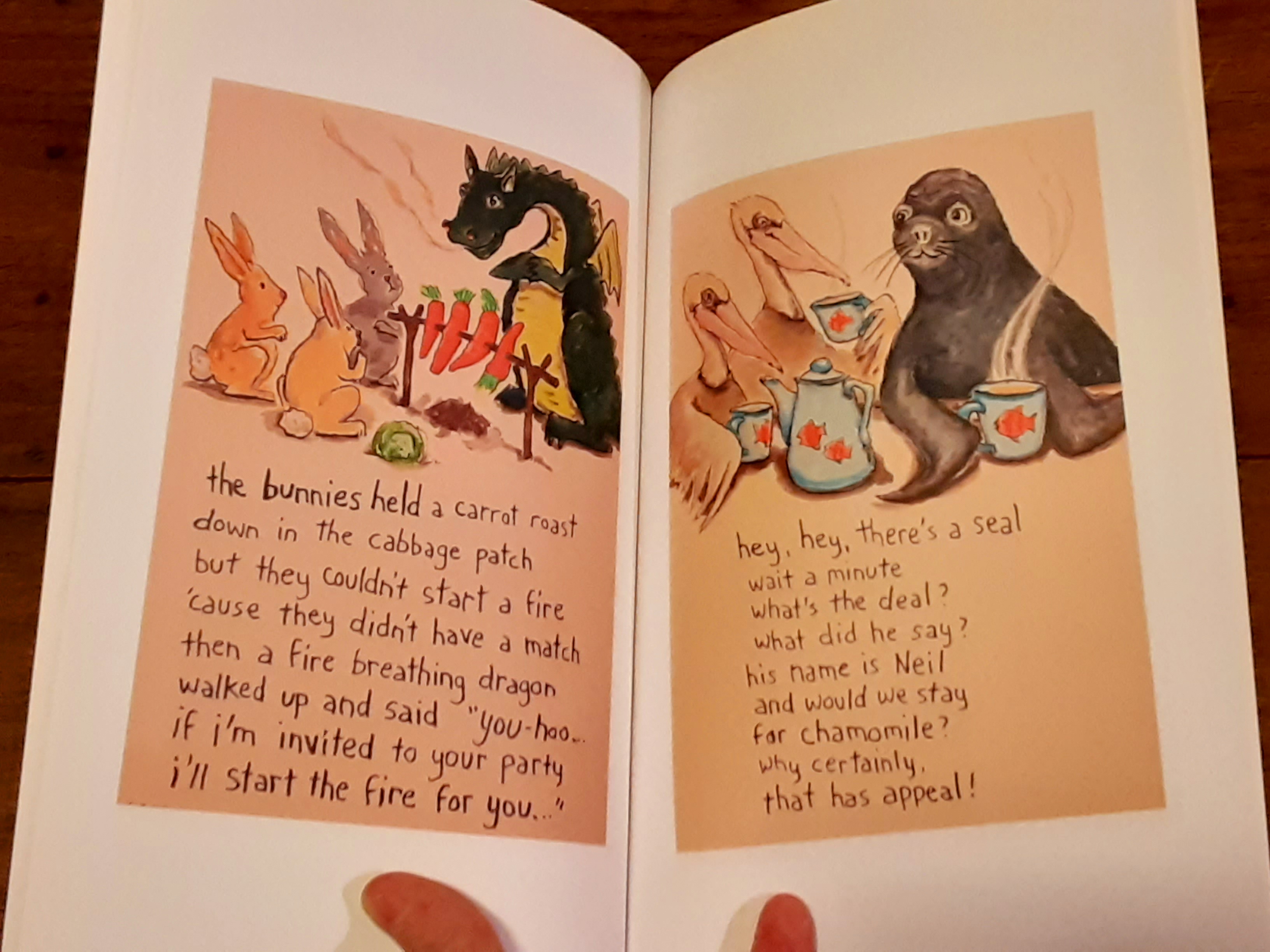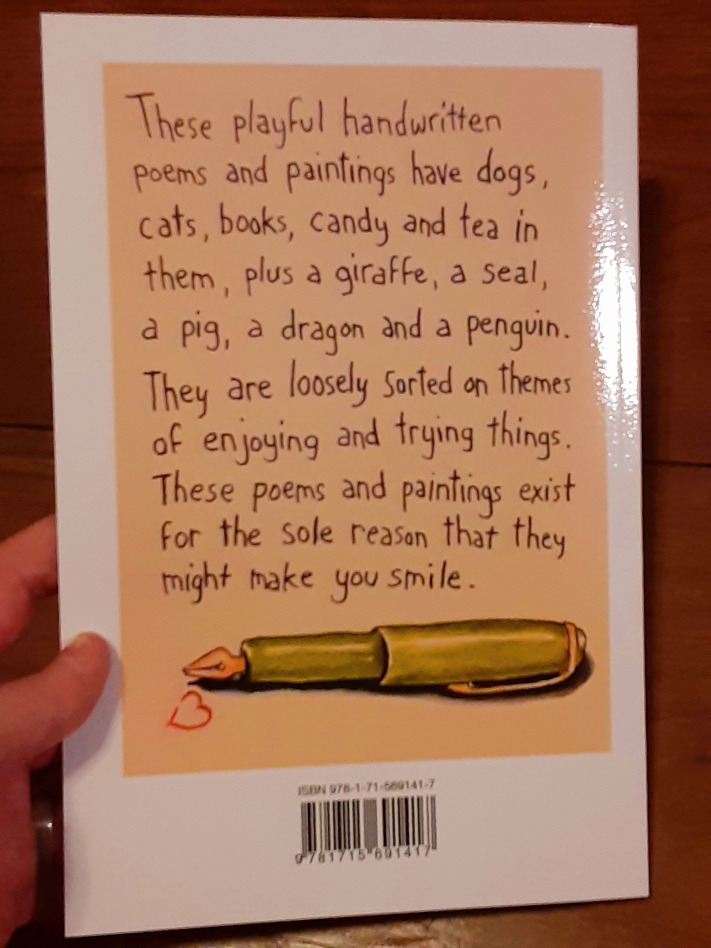 These playful handwritten poems and paintings have dogs, cats, books, candy and tea in them, plus a giraffe, a seal, a pig, a dragon and a penguin. They are loosely sorted on themes of enjoying and trying things. These whimsical poems and paintings exist for the sole reason that they might make you smile