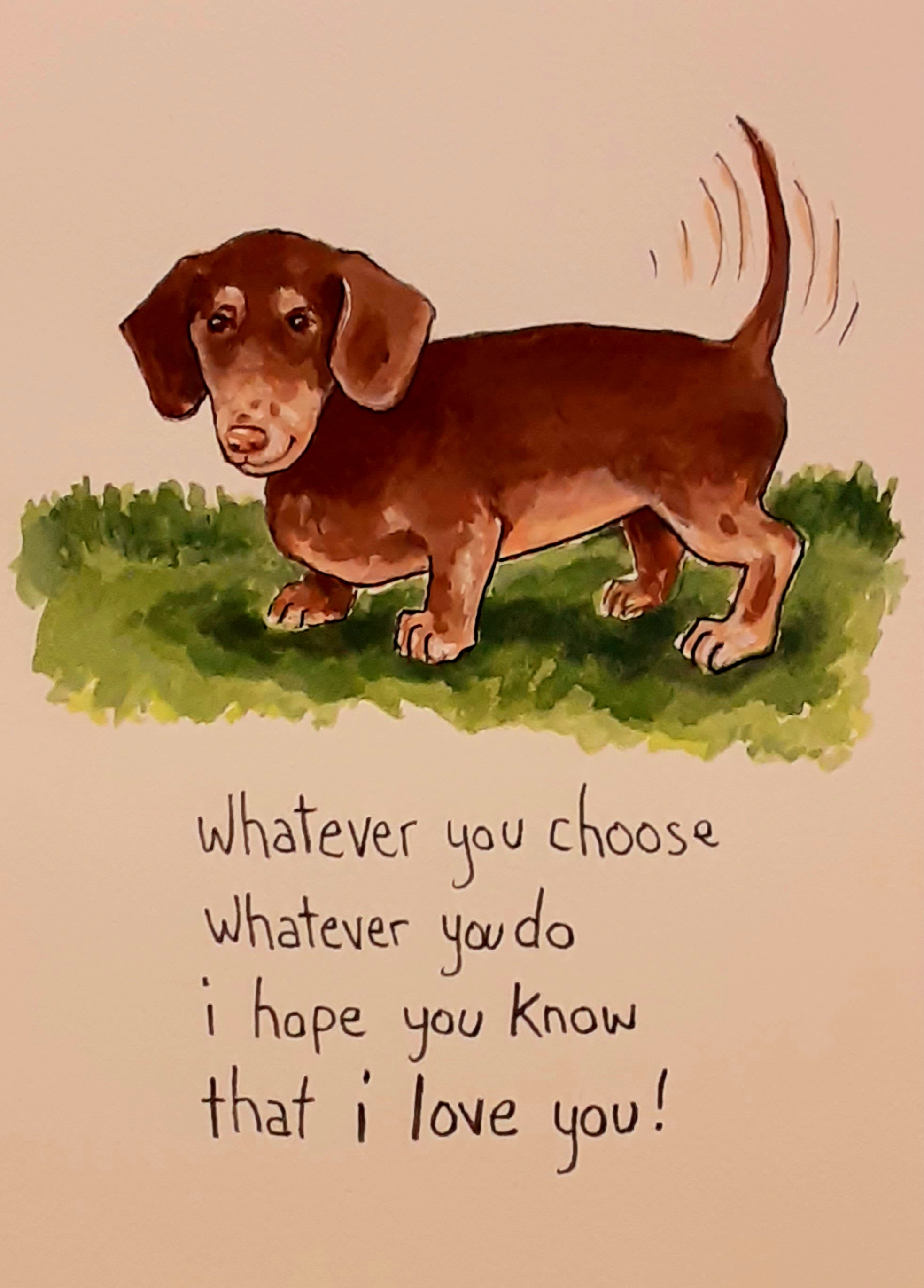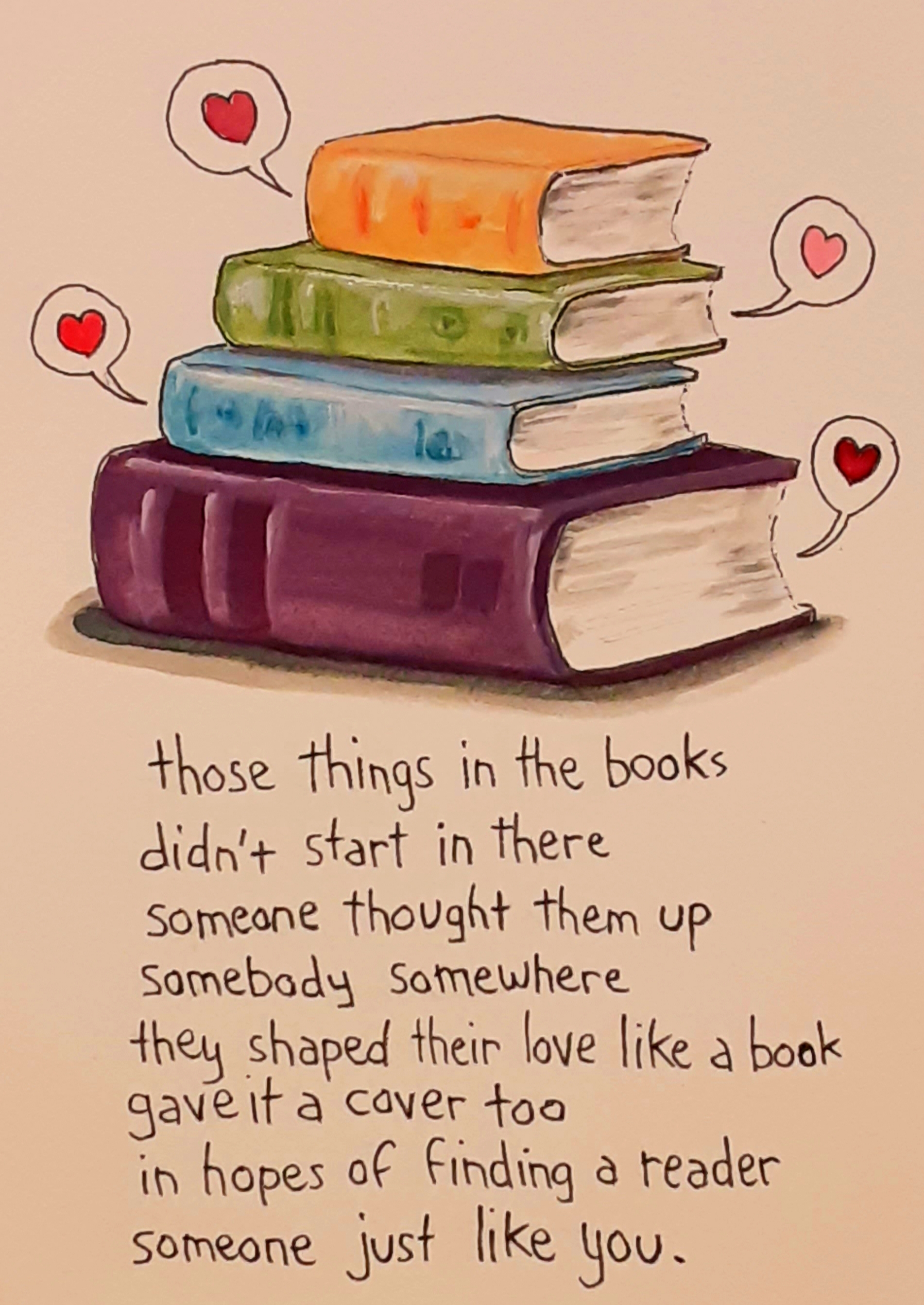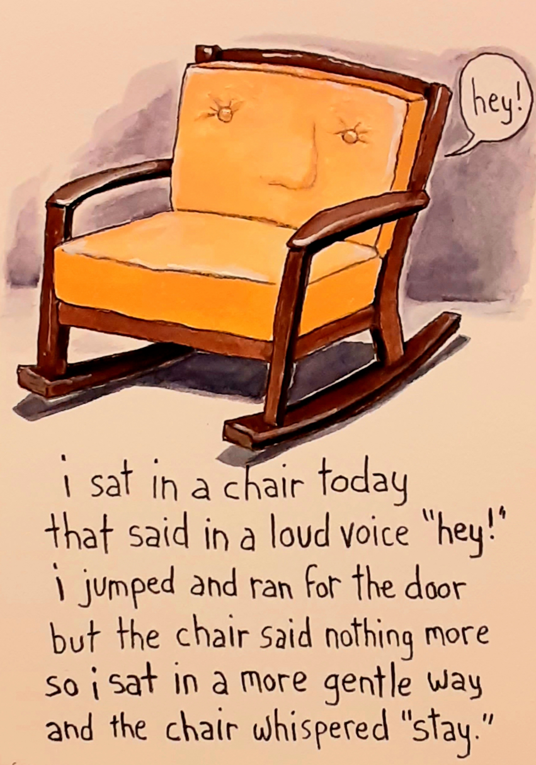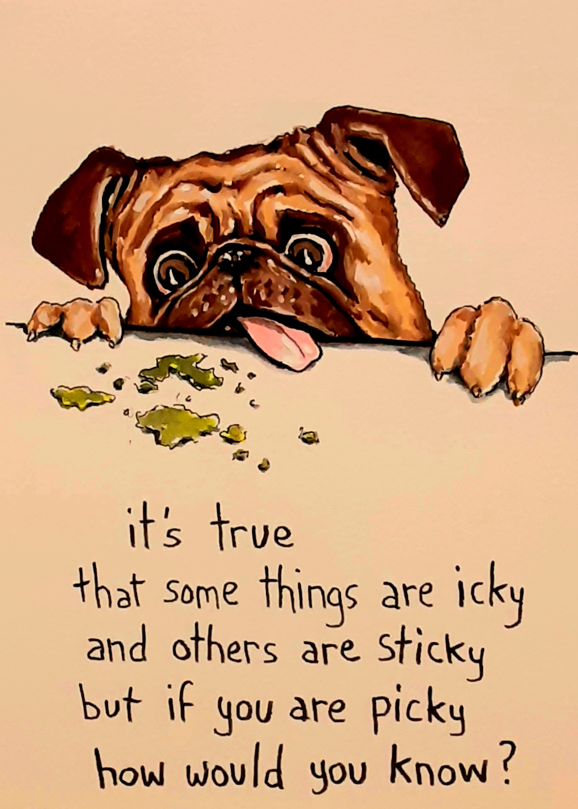 These playful handwritten poems and paintings have dogs, cats, books, candy and tea in them, plus a giraffe, a seal, a pig, a dragon and a penguin. They are loosely sorted on themes of enjoying and trying things. These whimsical poems and paintings exist for the sole reason that they might make you smile