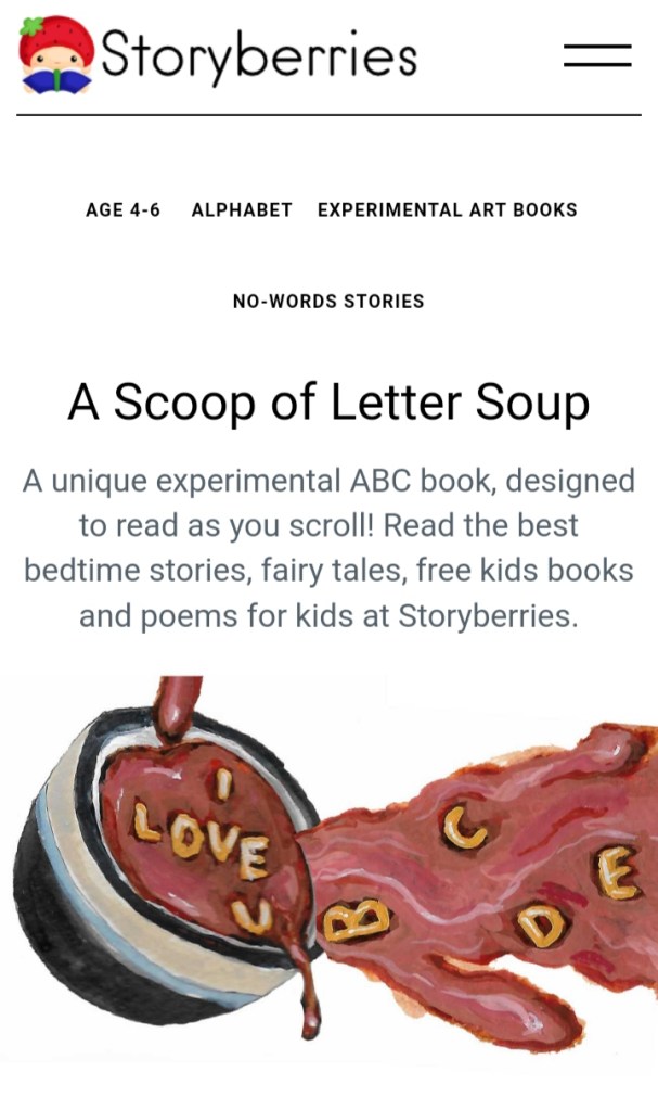 In the video Clancy is showing “A Scoop Of Letter Soup” a handmade artist book that plays in a visual way with the rhythm of poetry and the flow of soup. Clancy made a digital ebook version of this artist book for the experimental art category of Storyberries.com – a free ebook site for children. The “experimental” part of this original artist book is that Clancy is playing with the way digital ebooks on Storyberries flow up and down. You can see the Stoyberries ebook version of “A Scoop Of Letter Soup” via this link and below.